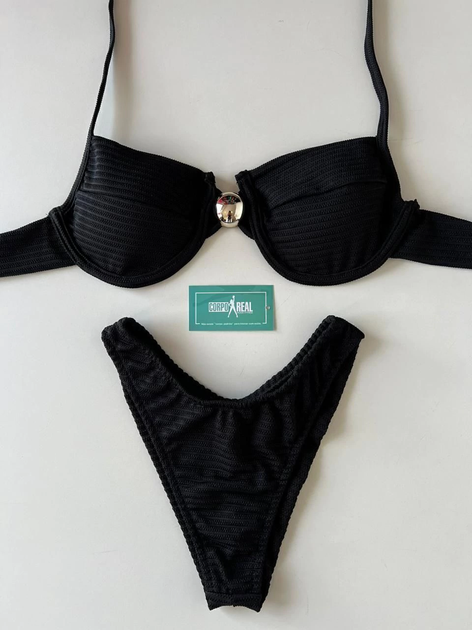 Biquíni composto por parte de cima modelo meia taça com aro. Possui bojo removível e aplicação de aviamento dourado, deixando o modelo exclusivo. Amarração no pescoço e atrás para melhor ajuste. Parte de baixo as delta, fio duplo.