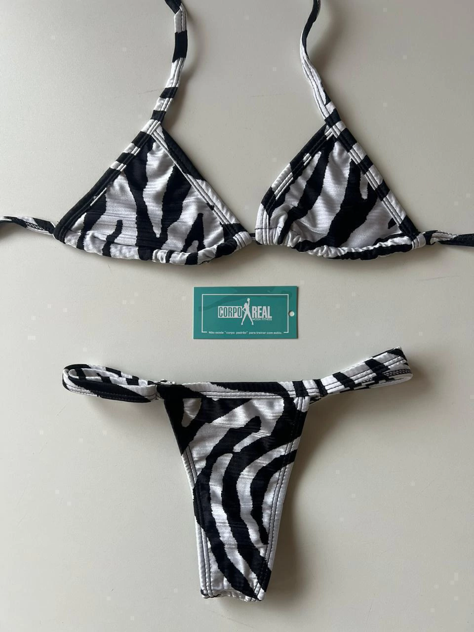 Biquíni composto por parte de cima modelo cortininha com entrada para bojo e calcinha fio dental. Possui forro interno, alças achatadas para o bronze perfeito e regulador nas laterais da calcinha.