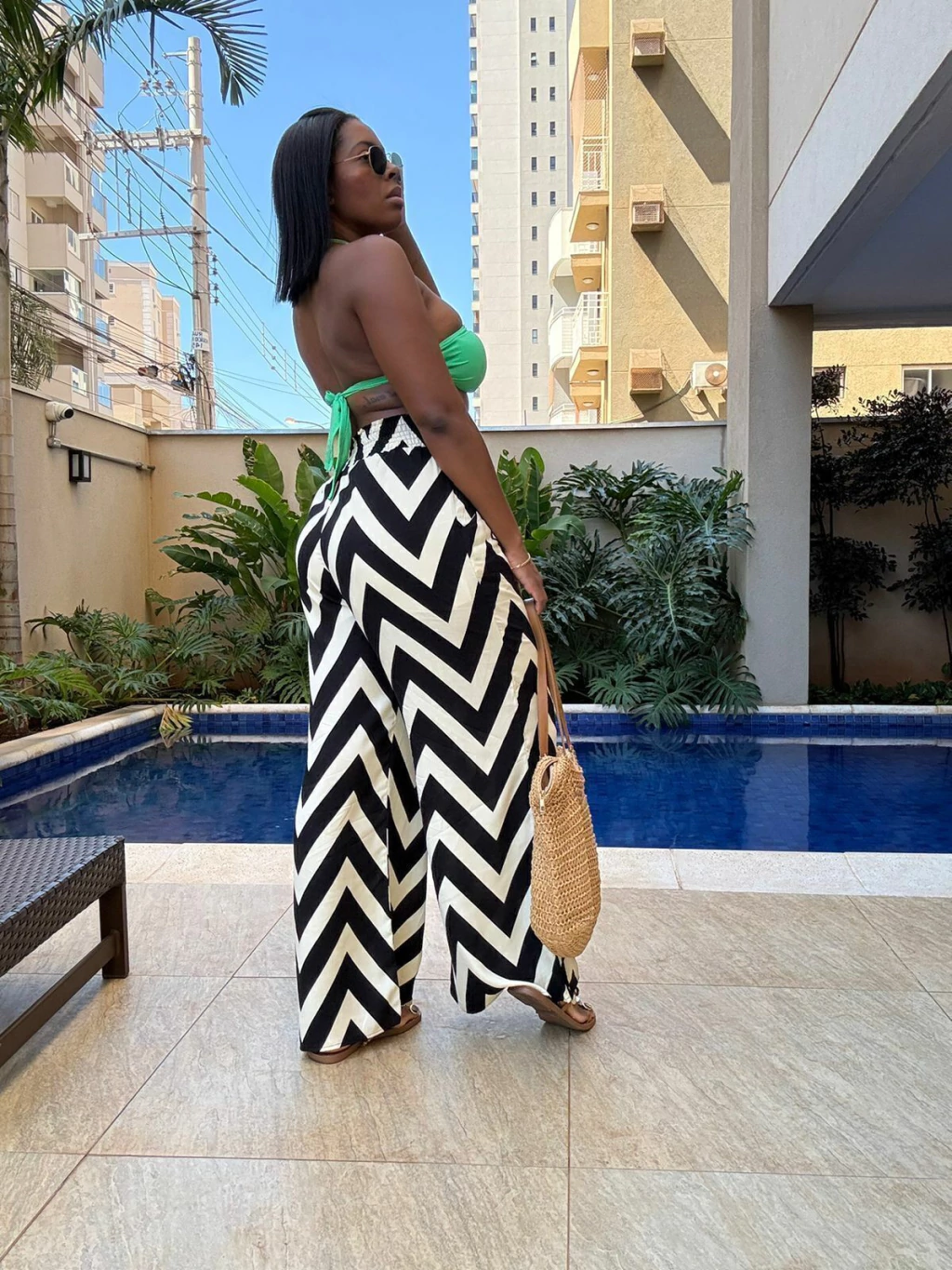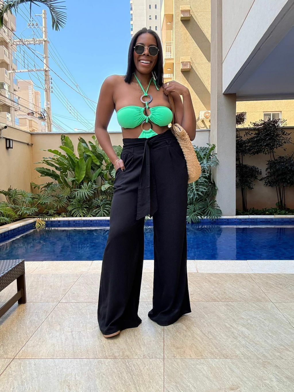 Calça em viscose, super leve e fluído. Possui forro interno e laço na cintura para melhor ajuste. O corte alfaiataria eleva a elegância e sofisticação da peça, e o elástico atrás modela e desenha o corpo sem apertar.