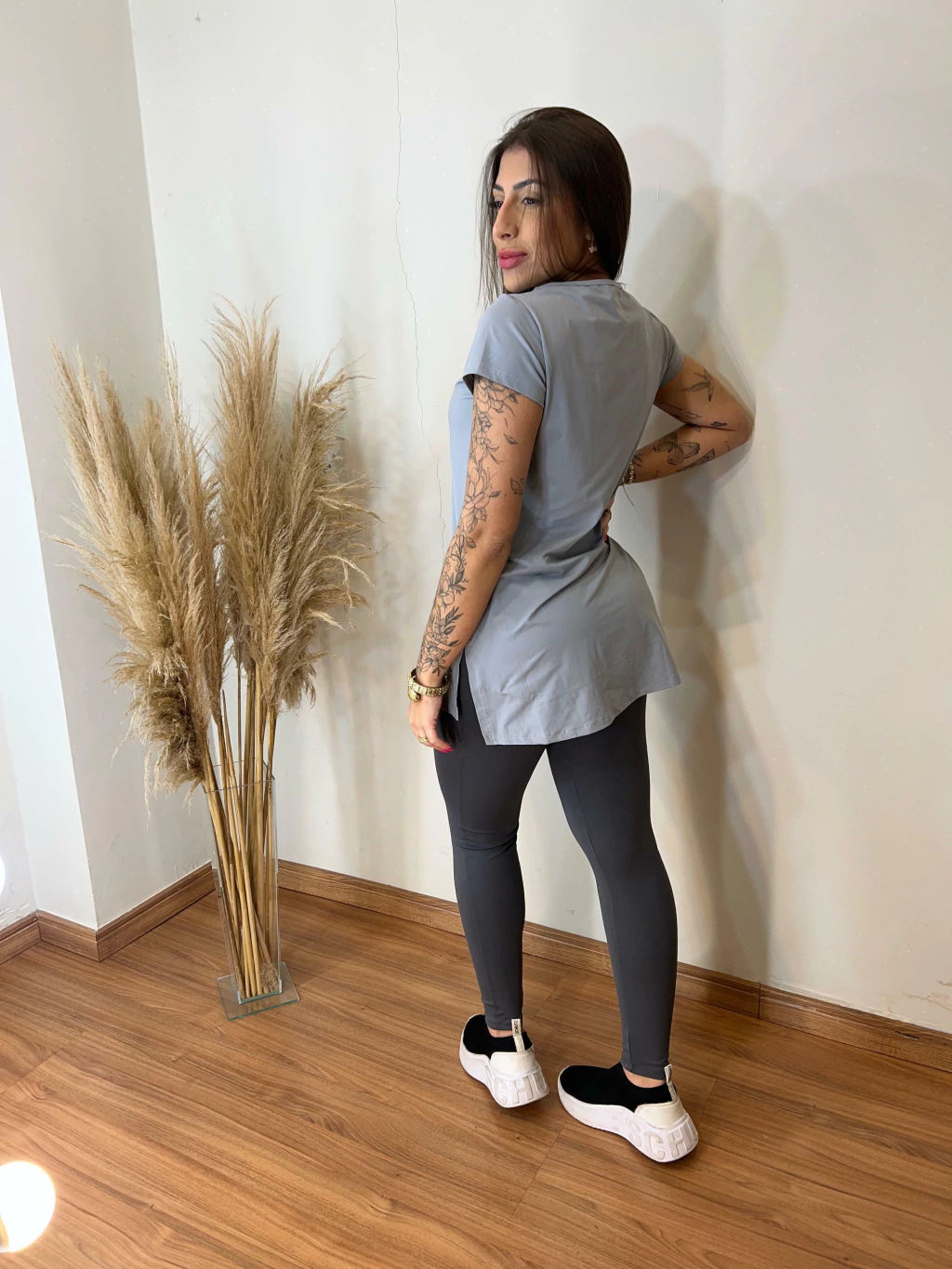 Camiseta em poliamida liso, possui toque geladinho, máximo conforto. Possui mangas e barra alongada, efeito tapa bumbum com detalhe de recorte lateral. Modelo slim, ajusta no corpo.