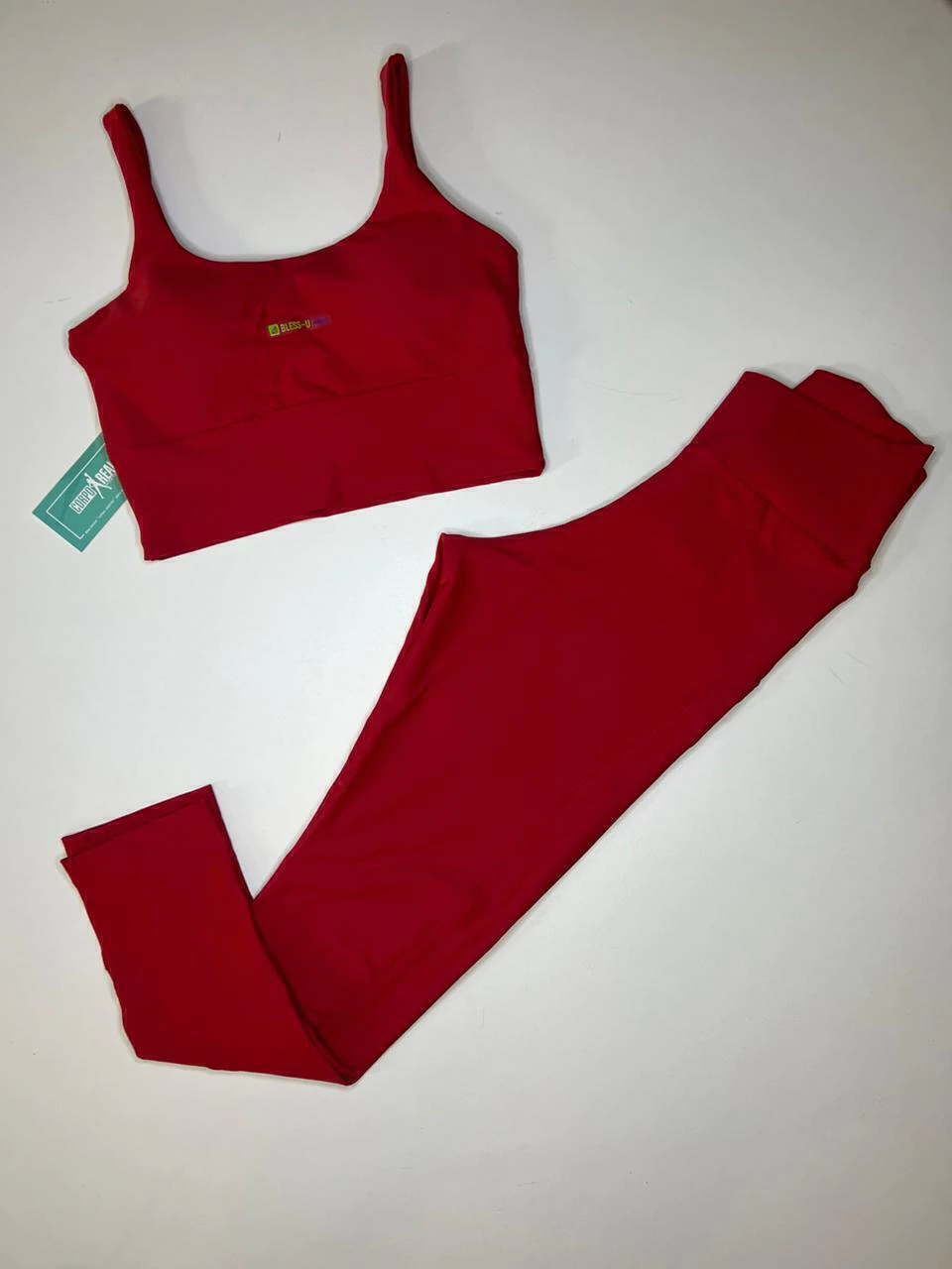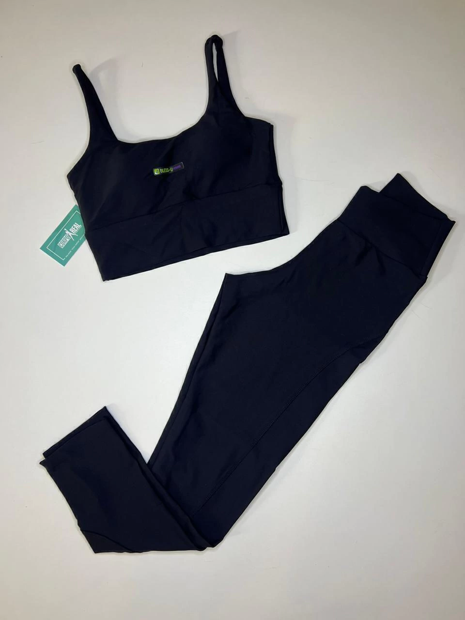 Conjunto em poliamida liso. Acompanha top básico, reto, com alças finas. Possui forro frontal e bojo removivel. Legging com recortes anatômicos, cós transpassado em V.