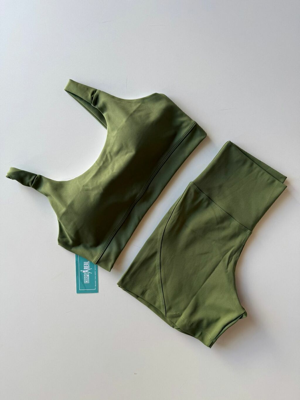 Conjunto em poliamida Athletic, liso e firme. Possui top modelo faixa com alças mais largas, forro interno e bojo removível, e short cós alto com recortes anatômicos que modelam o corpo. Zero transparência, blockout.