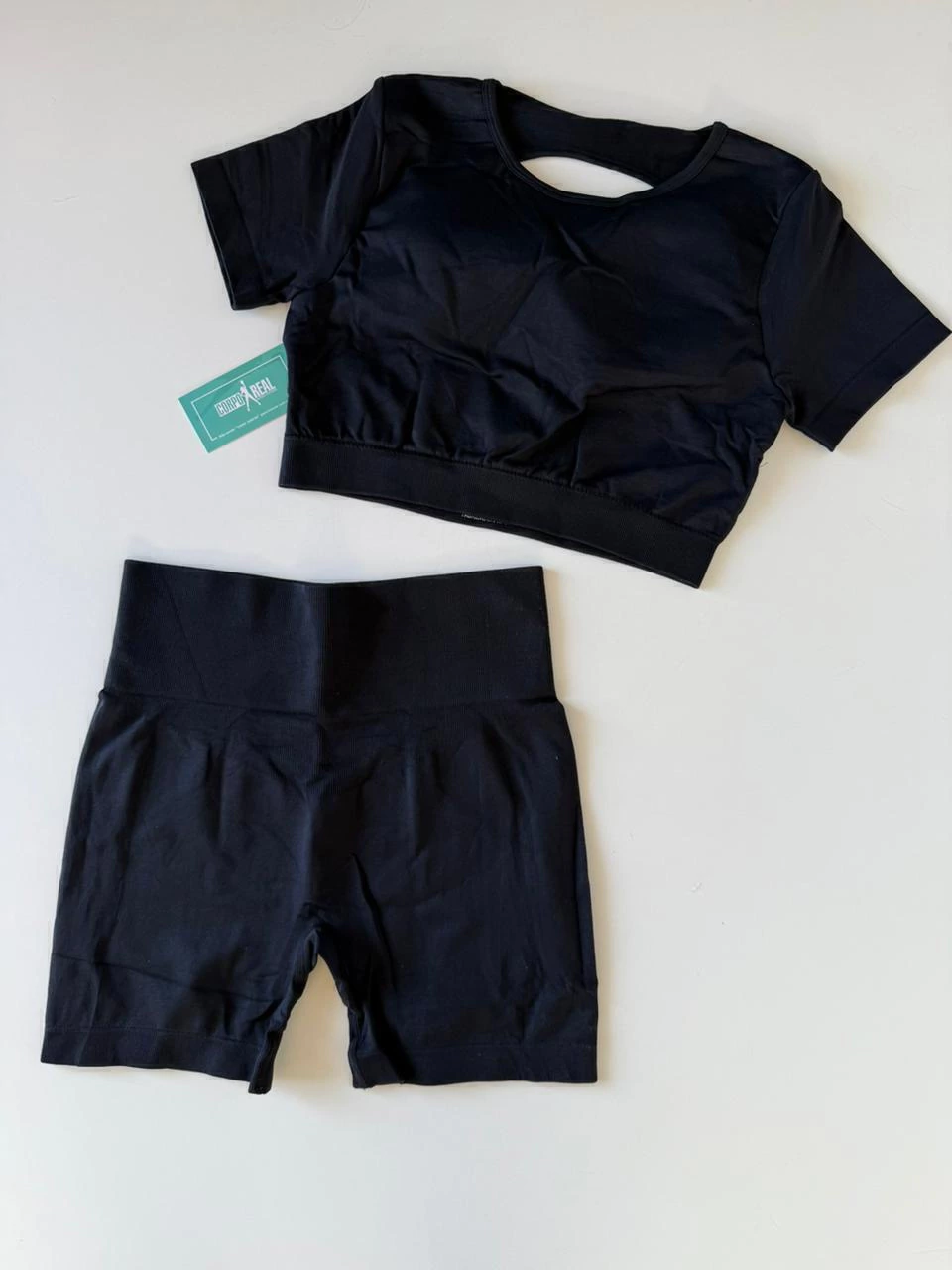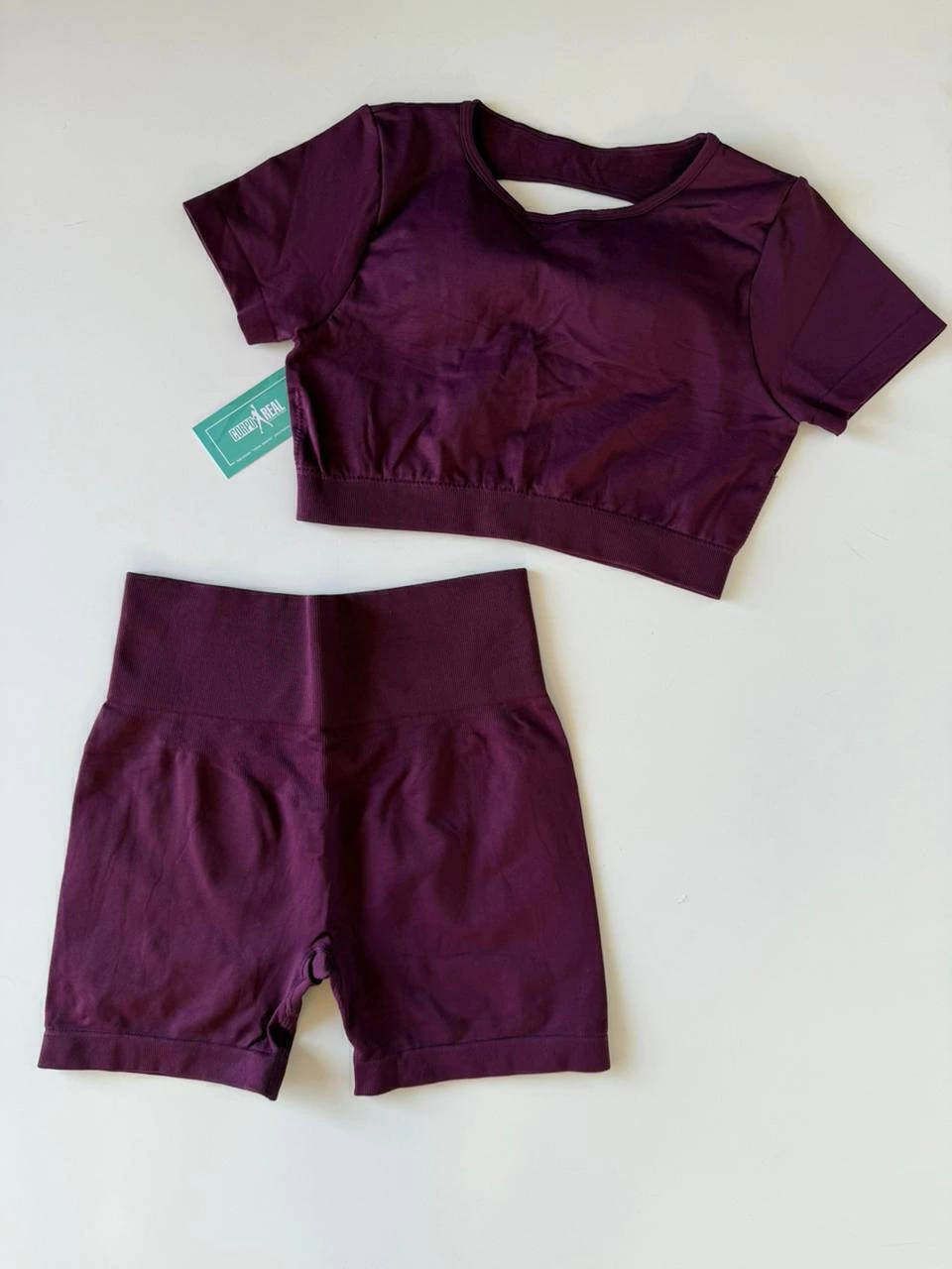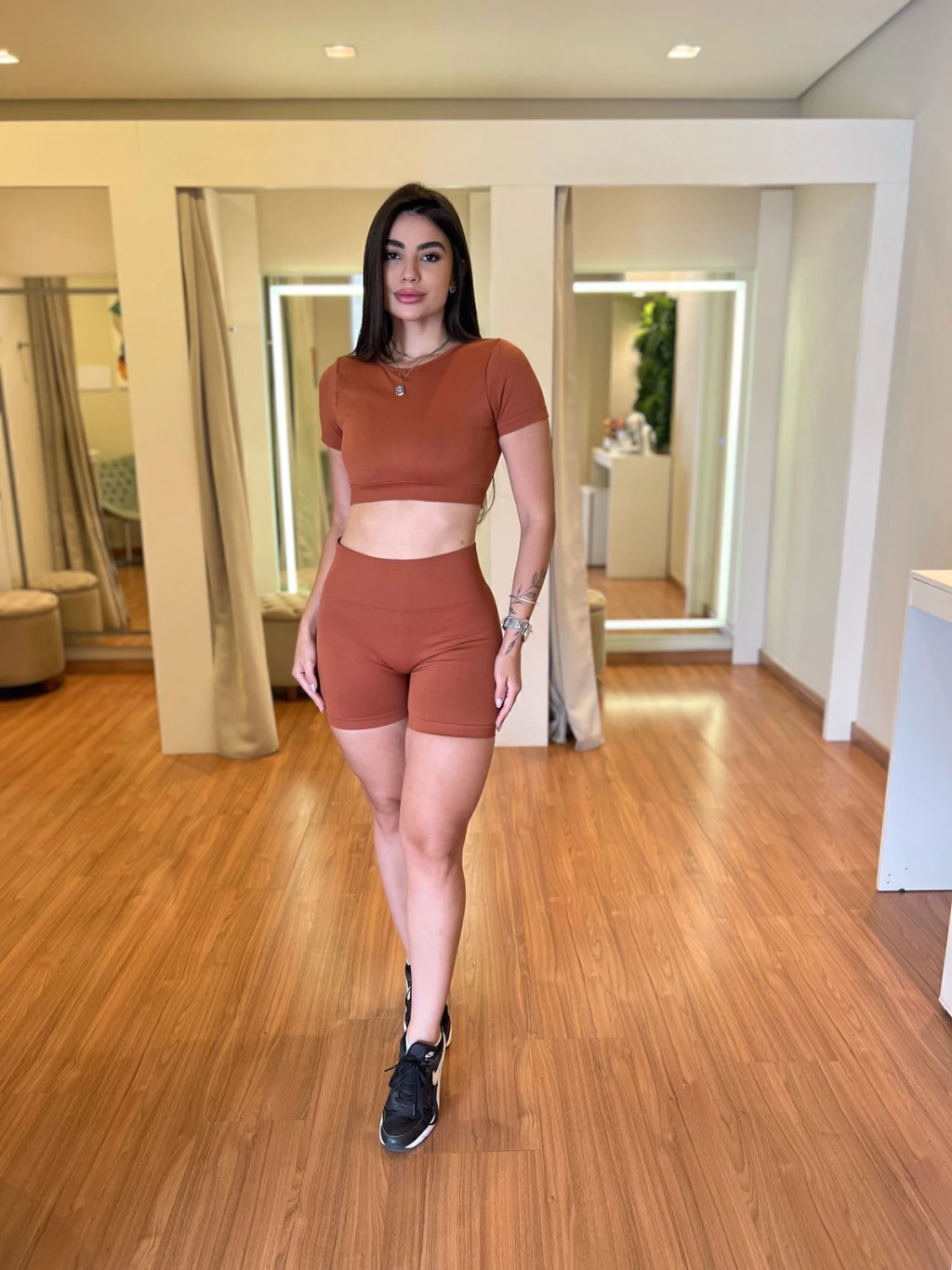 Conjunto em poliamida SEAMLESS (sem costura). Acompanha cropped de manguinha com detalhe de recorte nas costas e shotr básico com cós duplo.