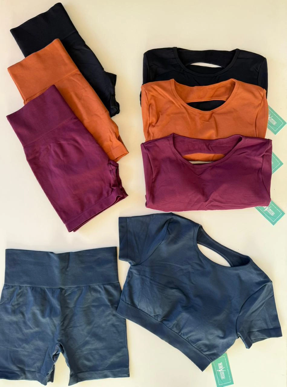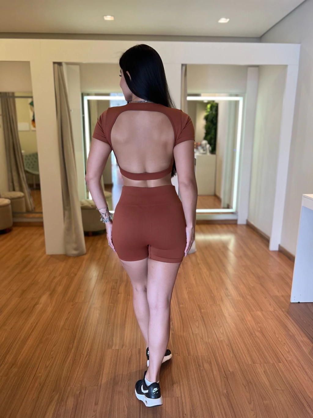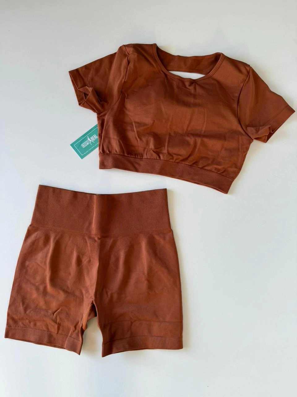 Conjunto em poliamida SEAMLESS (sem costura). Acompanha cropped de manguinha com detalhe de recorte nas costas e shotr básico com cós duplo.