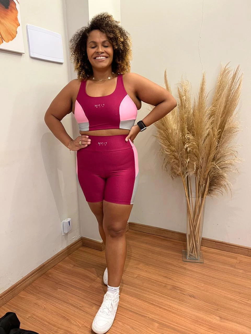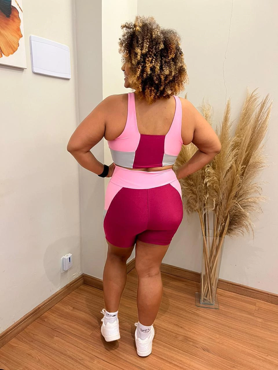 Conjunto de Short Fitness Rise: alta compressão, zero transparência e proteção UV50+ para treinos com conforto e segurança. Top sustentável, moderno e estiloso, garante firmeza, elegância e performance em cada movimento.