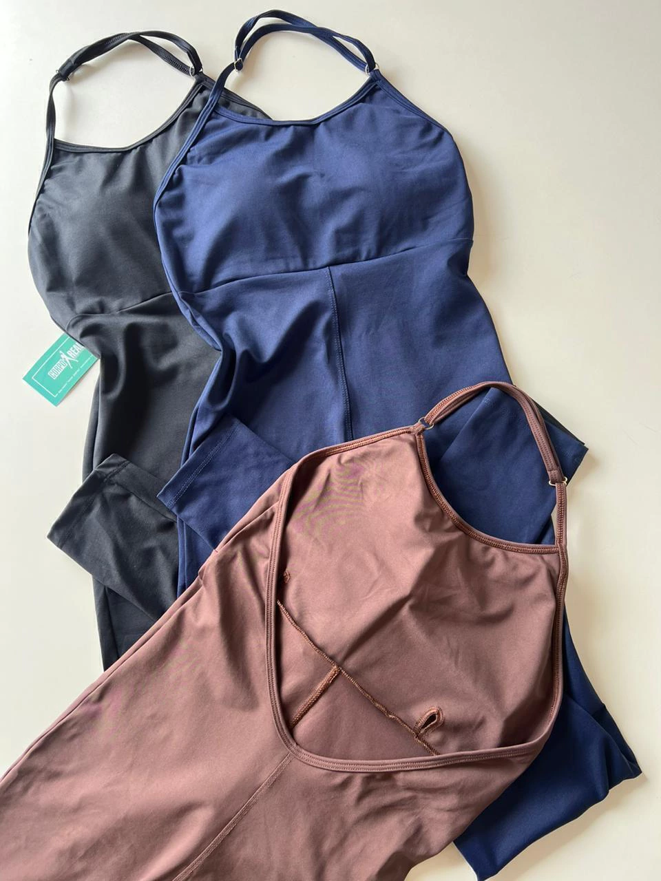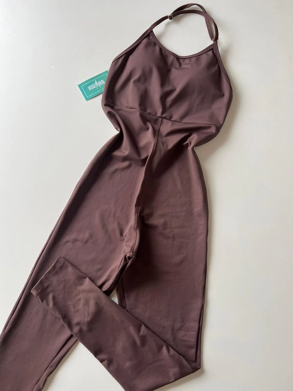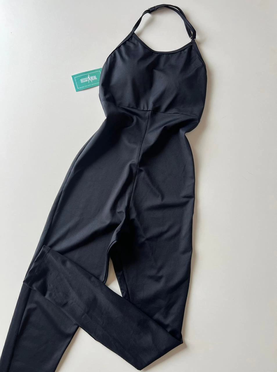 Macacão em poliamida liso light (mais molinho). Modelo frente única, com regulador na alça do pescoço e detalhe de costa nua.