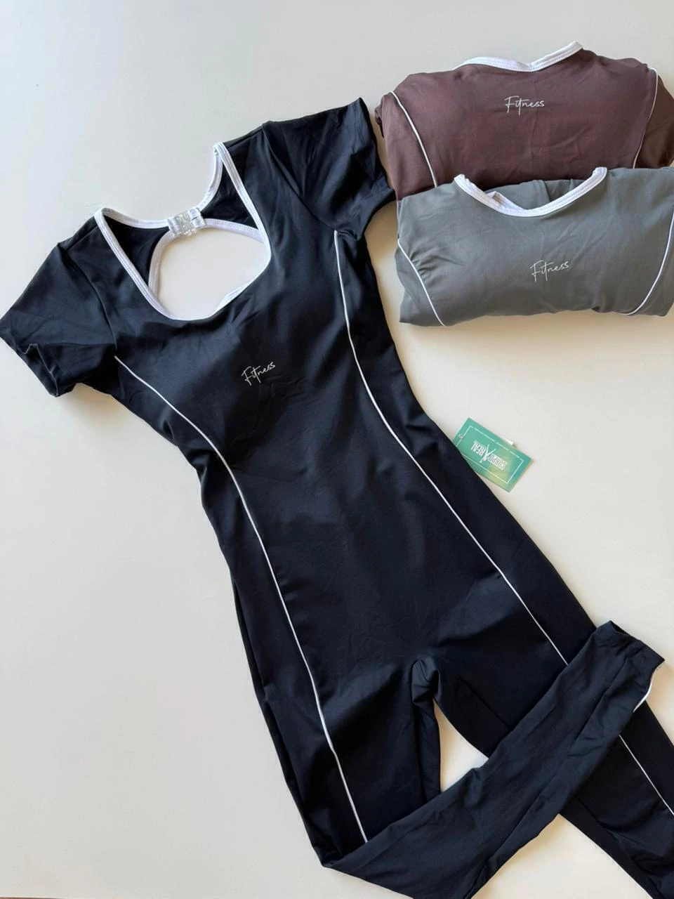 Macacão longo em poliamida liso, possui compressão média. Possui manguinhas curtas, viés nas laterais para modelar o corpo, e decote nas costas. Fecho em acrílico.
