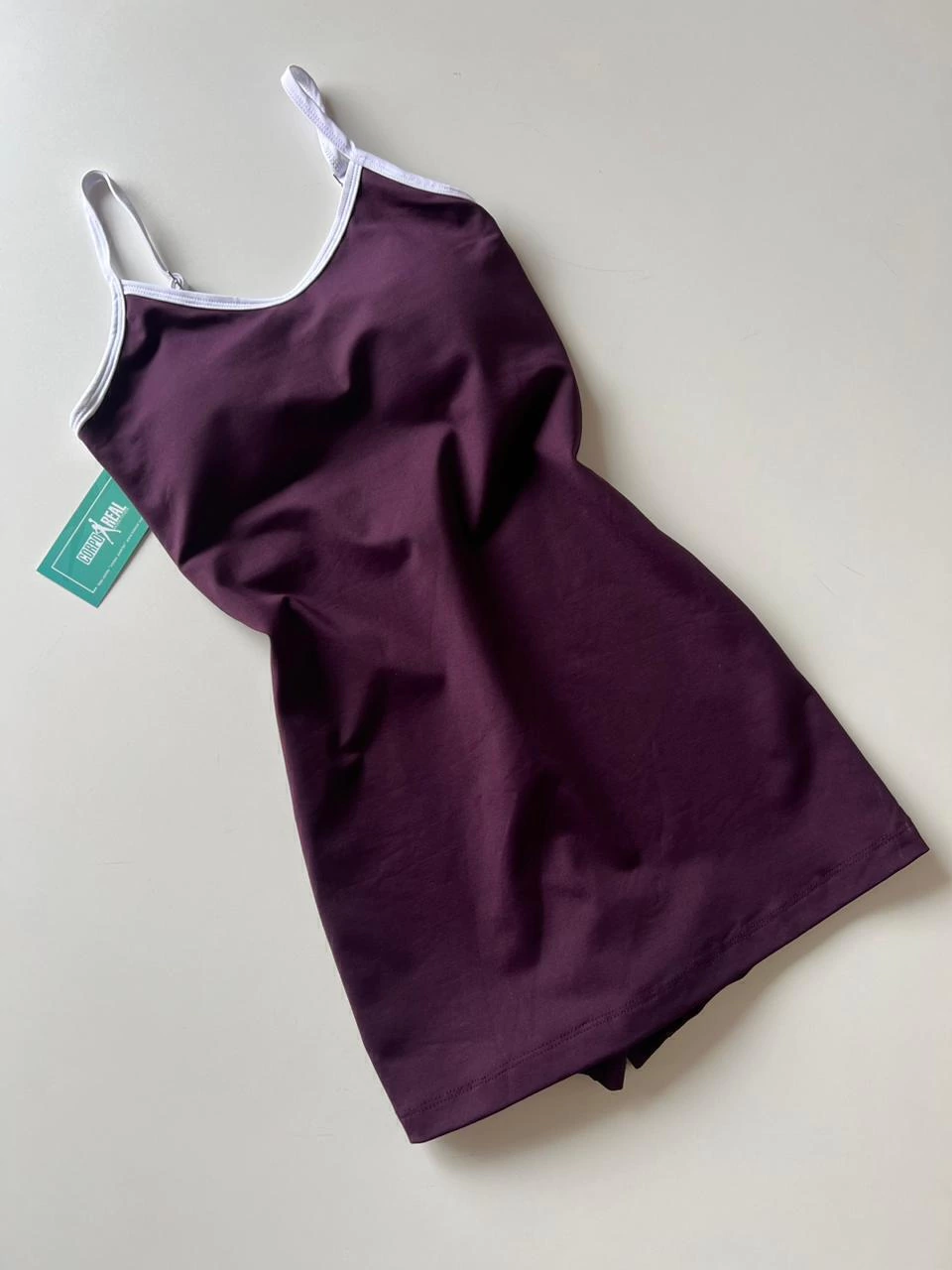Macaquinho em poliamida liso. Possui alças finas com reguladores, modelo saia na frente e short atrás. Comprimento curto.