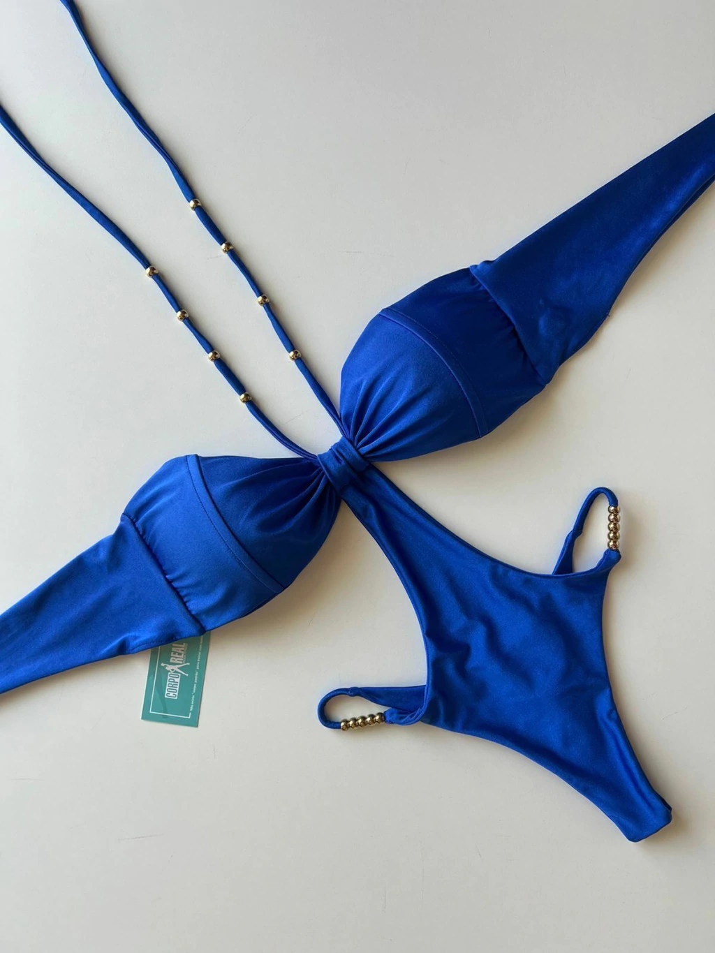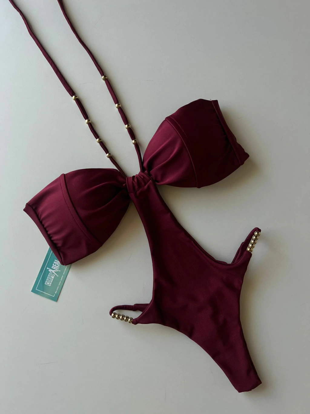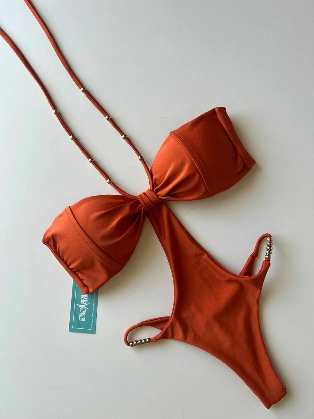 Maiô | Body em poliamida trilobal (leve brilho). Possui bojo removível e amarração no busto e no pescoço. Calcinha semi fio, fio duplo, proporcionando maior conforto. Detalhes em aplicação dourados que deixam a peça mais sofisticada e exclusiva.