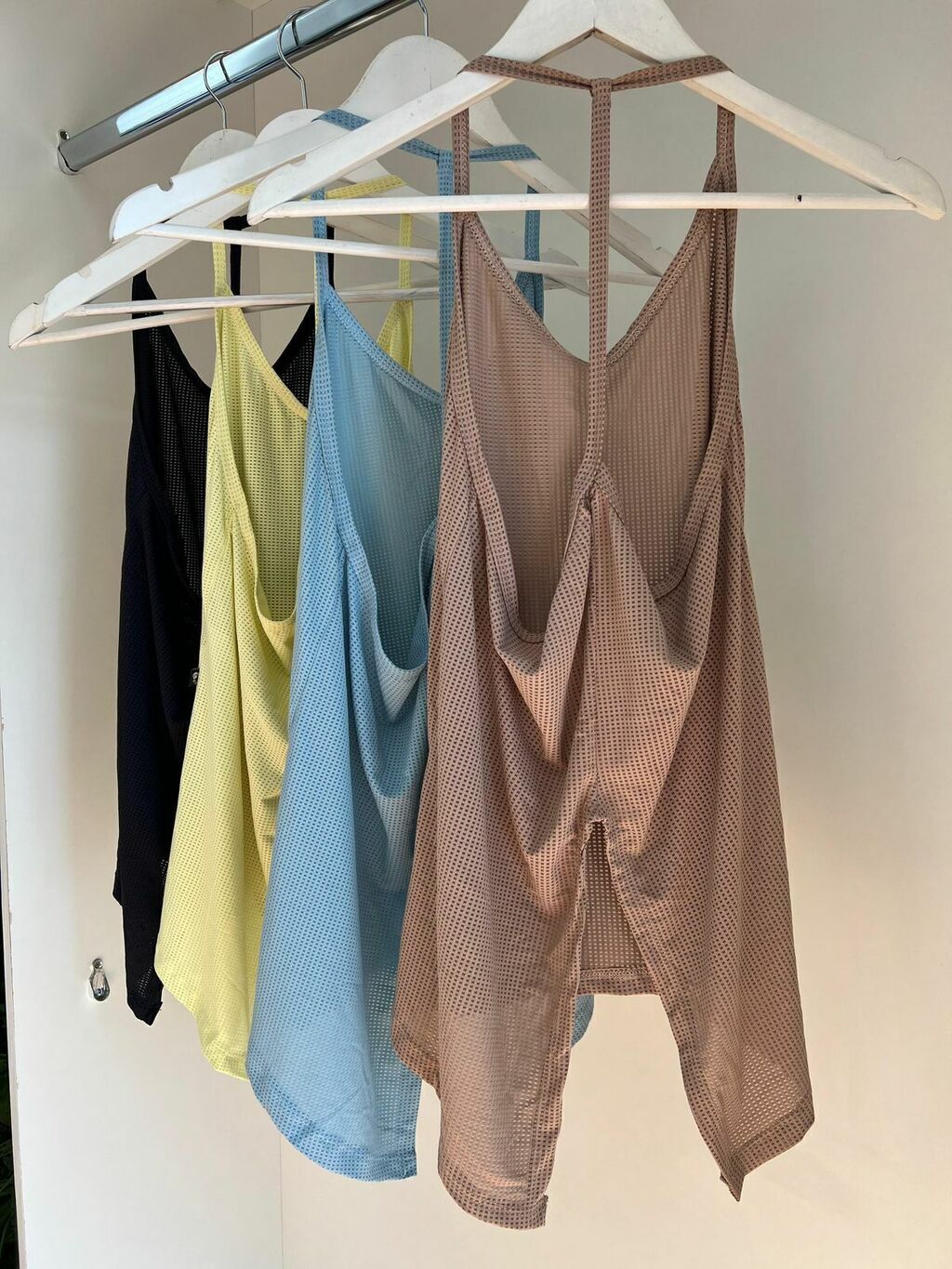 Blusa de alças finas e costa a mostra. Estilo bata com barra alongada. Possui recorte atrás, deixando a peça com um caimento impecável. Tecido Dryfit - Tecnologia de microfuros que permitem a respiração da pele e evaporação do suor, mantendo sempre sequinha.